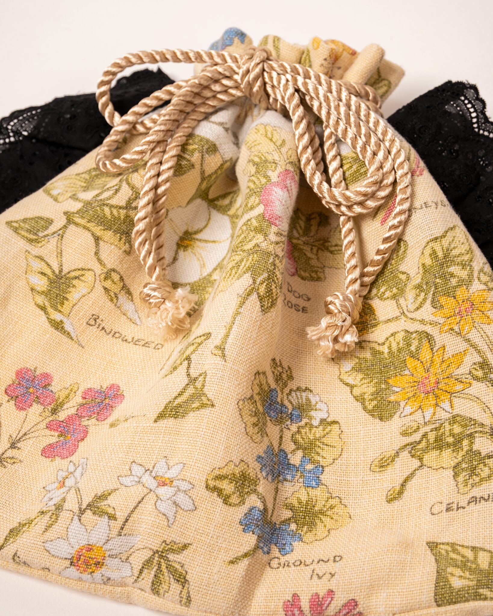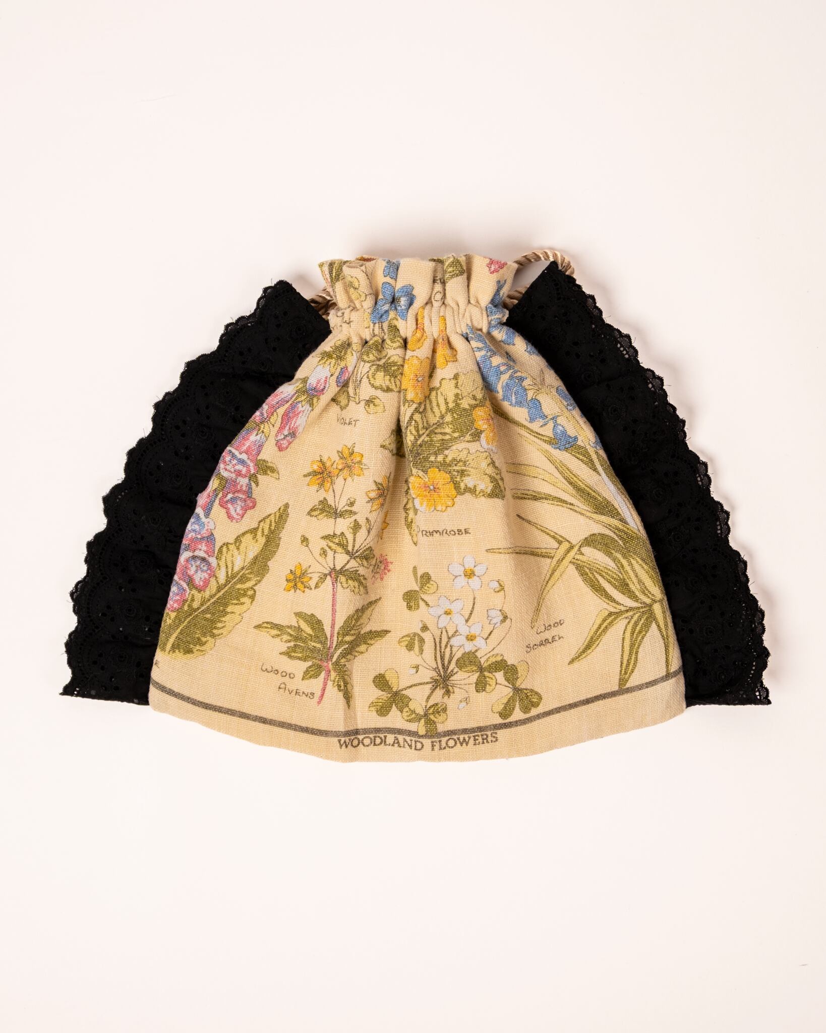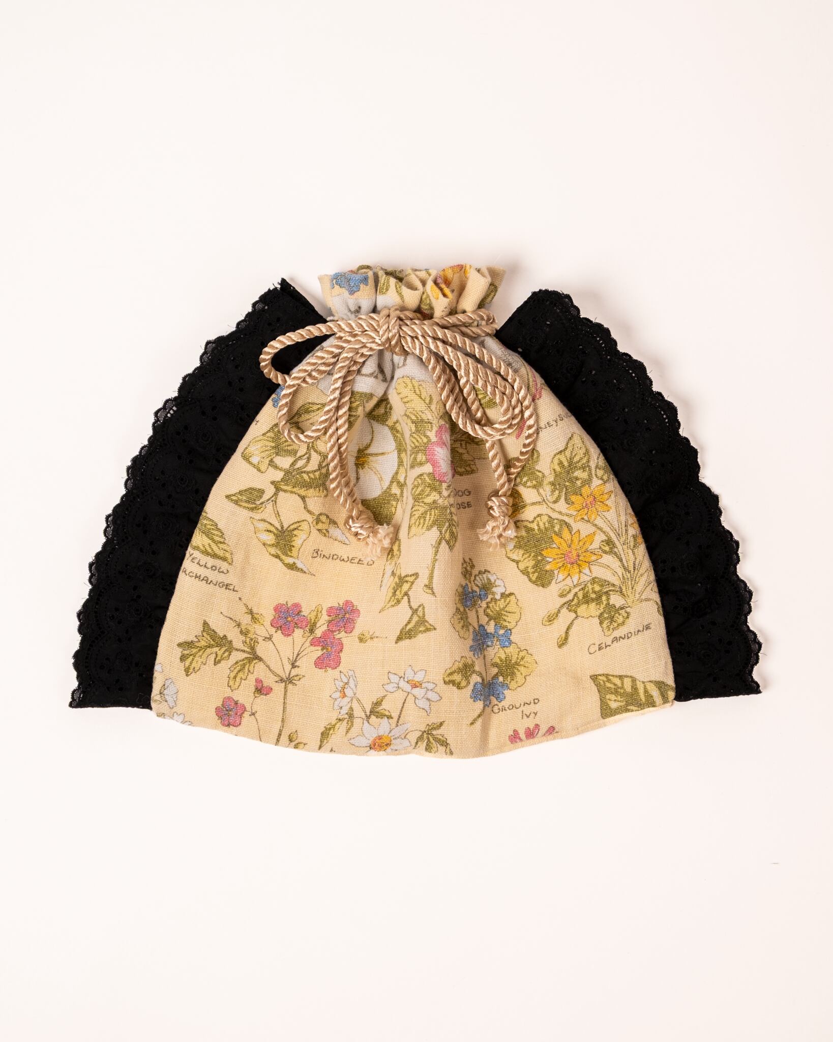 ヴィンテージクロスとコットンレースで巾着バッグを作成しました。
